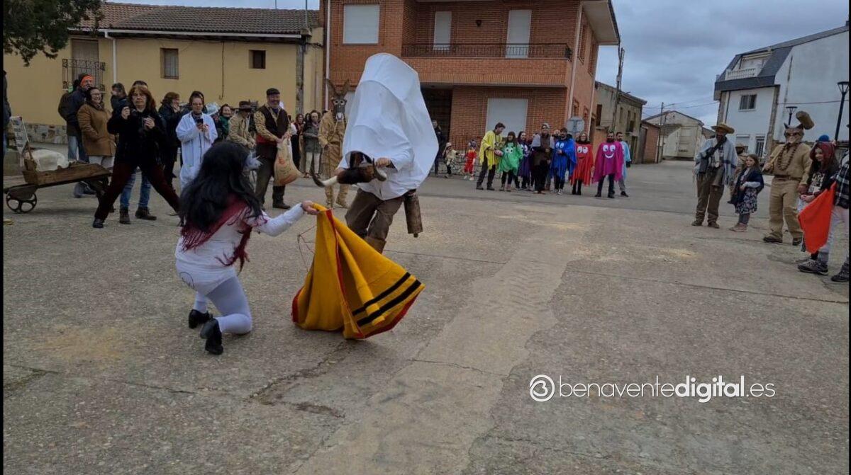 Era a partir de las tres de la tarde cuando los mozos se juntaban en un corral ya prefijado. Allí se disfrazaban ayudándose unos a otros durante un buen rato. A las puertas del corral, en la calle, ya se agolpaban los chicos y chicas del pueblo al grito de: “¡Qué salga el toooró, con cueeernos y tooodó!”. De vez en cuando hacían el amago de salir y toda la audiencia salía disparada por las calles adyacentes. Al ser falsa alarma volvían a las puertas del corral y repetían los cánticos. En una de esas añagazas la salida del toro, torero y demás personajes era real y ahí comenzaban las carreras de torero y toro tras chicos y chicas. El torero casi siempre se iba a por las chicas porque en el agarre había “algo más que simples sujeciones” para que el toro corneara.