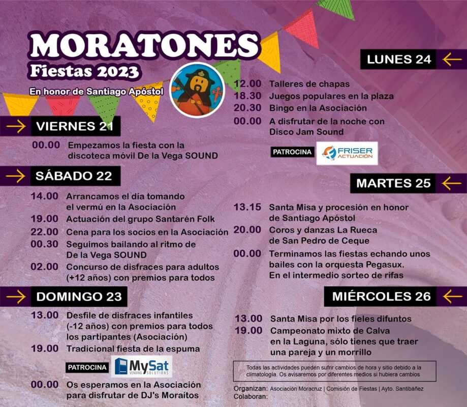 Los vecinos de Moratones de Vidriales abren mañana viernes 21 de julio la programación festiva en honor a su patrón, Santiago Apóstol. Un abanico de actos que se extiende hasta el miércoles 26. Verbenas, juegos autóctonos como la calva, juegos populares, concursos, desfiles, fiesta de la espuma, actos religiosos y actuaciones de grupos de música y baile tradicionales forman parte de este programa festivo organizado con mimo por la asociación Moracruz, Comisión de Fiestas y el Ayuntamiento en colaboración con firmas comerciales y voluntarios.