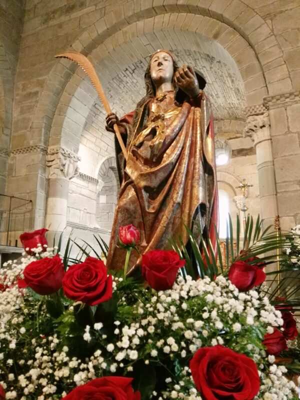 Devotas del pueblo de Santa Marta de Tera han procurado ornamentar con la mayor dignidad la imagen de la virgen y mártir representada en una esbelta talla barroca. No se ha instalado sobre las andas, porque este año y por culpa de la pandemia no se permite organizar la procesión por las calles, pero sí estará en un lugar privilegiado del presbiterio, para recoger las miradas de sus devotos.