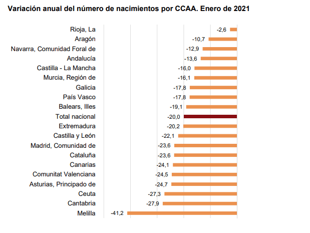 La significativa caída de nacimientos en enero en Zamora fue general en todas las comunidades respecto al mismo mes del año pasado.  Mientras la media nacional refleja una caída del 20%, las mayores disminuciones se dieron en Cantabria (–27,9%), Principado de Asturias (–24,7%) y Comunidad Valenciana (–24,5%), además de en las ciudades autónomas de Ceuta y Melilla. También en Castilla y León bajaron por encima de la media nacional, con un 22% menos. Por el contrario, los descensos menos acusados se registraron en La Rioja (–2,6%), Aragón (–10,7%) y Comunidad Foral de Navarra (–12,9%).