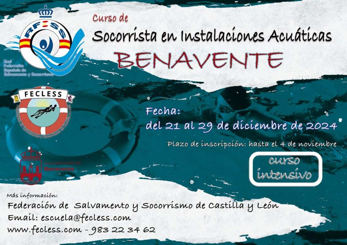 El Ayuntamiento de Benavente informa desde su Concejalía de Deportes que la Federación de Salvamento y Socorrismo de Castilla y León organiza un nuevo curso de socorrista en instalaciones acuáticas que se desarrollará en Benavente entre los días 21 al 29 de diciembre de forma intensiva.