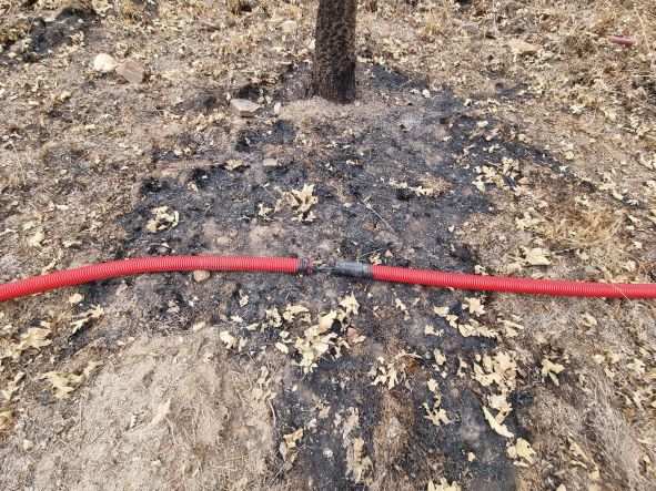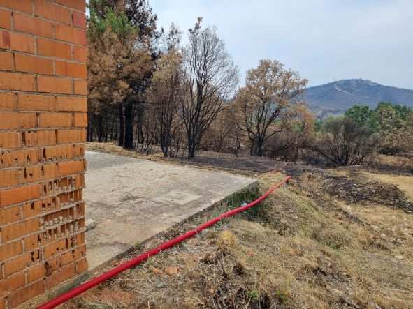 Se da la circunstancia que a una distancia de unos 150 metros, dos cables de alta potencia (15.000w) se bajan al suelo, a través de un macarrón rojo sobre el solado de tierra y entre la maleza, hasta el depósito de agua para dar servicio a una pequeña planta de desinfección instalada en el depósito principal a 5 metros del actual pozo de sondeo. Todo con el consiguiente triple riesgo, producir nuevos incendios, electrocutar a algún animal o, lo qué sería mucho más grave, afectar a alguna persona.