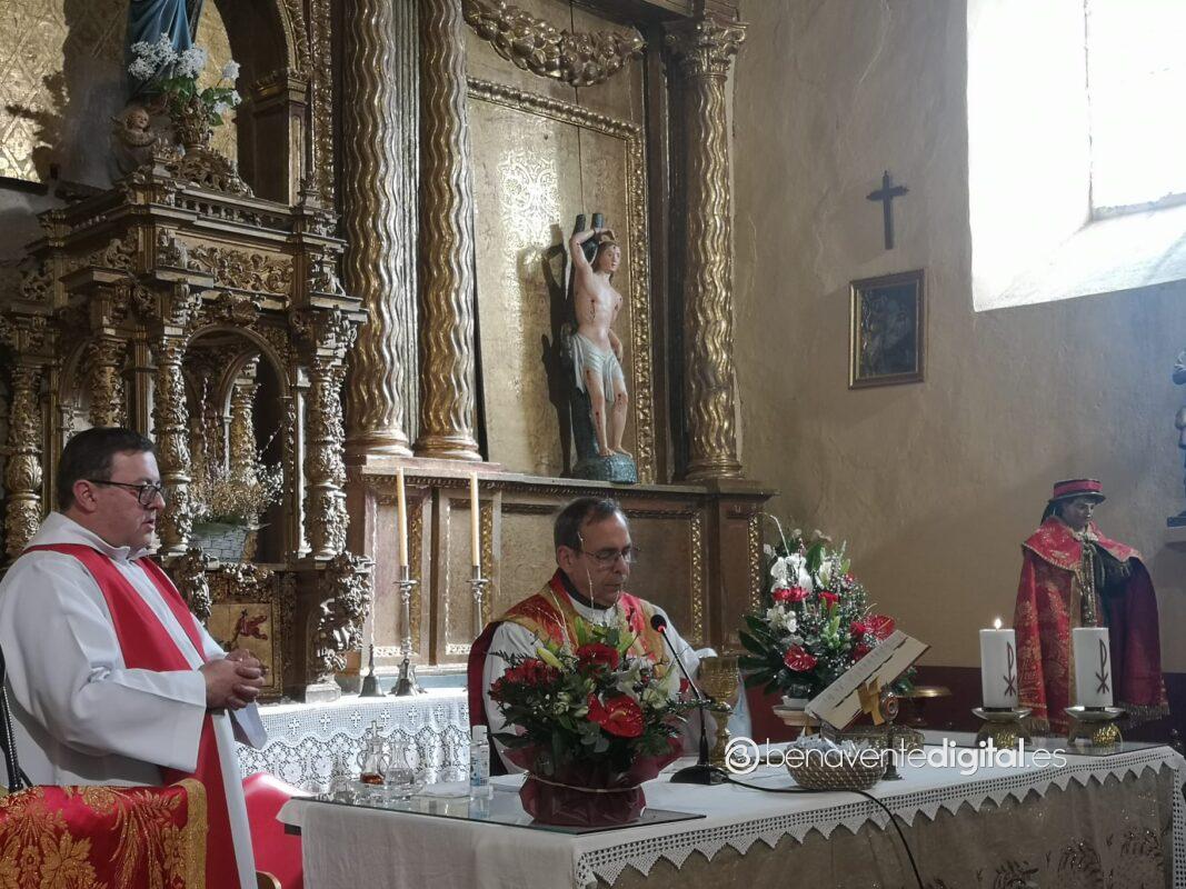 La jornada festiva en La Milla de Tera se pregonaba a los cuatro vientos con el repique de campanas anunciando que la solemne celebración religiosa estaba a punto de comenzar. Hasta Santo Tiso mostraba su complacencia al sentir el calor de sus devotos que llenaban el templo parroquial. En el altar se habían colocado las reliquias del santo copatrono y una cesta con los obsequios a los devotos. Fue el sacerdote natural del pueblo, Pedro Aparicio Blanco, quien se encargó de presidir la celebración, acompañado del párroco Raúl Vega quien actuó como maestro de ceremonias.