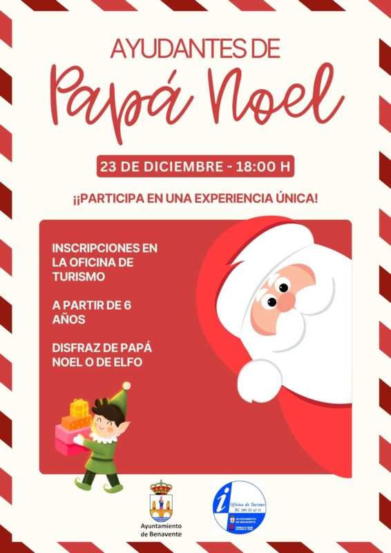 Desde hoy, día 18 de diciembre, todas aquellas personas que quieran participar como ‘Ayudantes de Papá Noel’ y desfilar junto a Santa Claus en su carroza, podrán inscribirse en la Oficina de Turismo de Benavente desde hoy. Para ello, deberán tener al menos 6 años de edad y deberán ir correctamente vestidos con el disfraz de elfo o de Papá Noel.