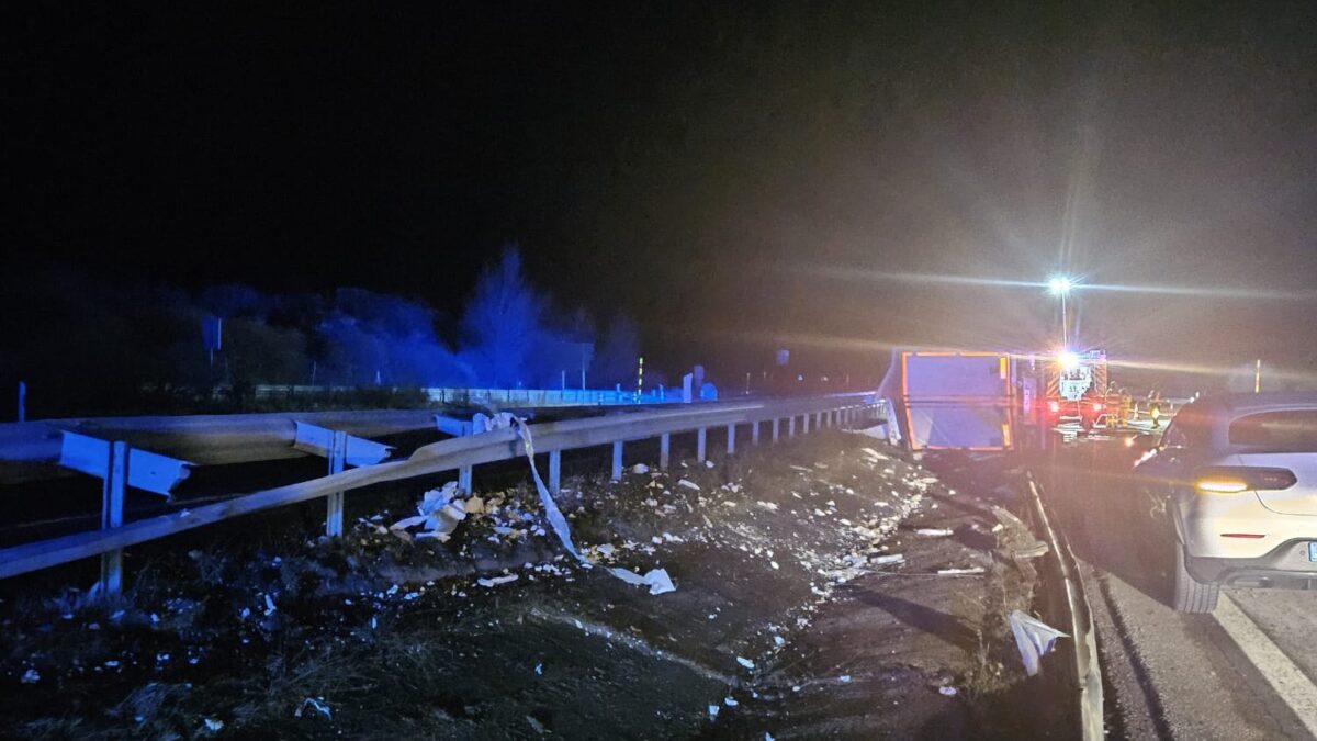 La actuación se produjo tras recibir el aviso del Centro de Emergencias de Castilla y León 1-1-2 a las 00:35 horas, alertando de la salida de vía de un camión articulado, que quedó volcado lateralmente sobre las biondas de protección.