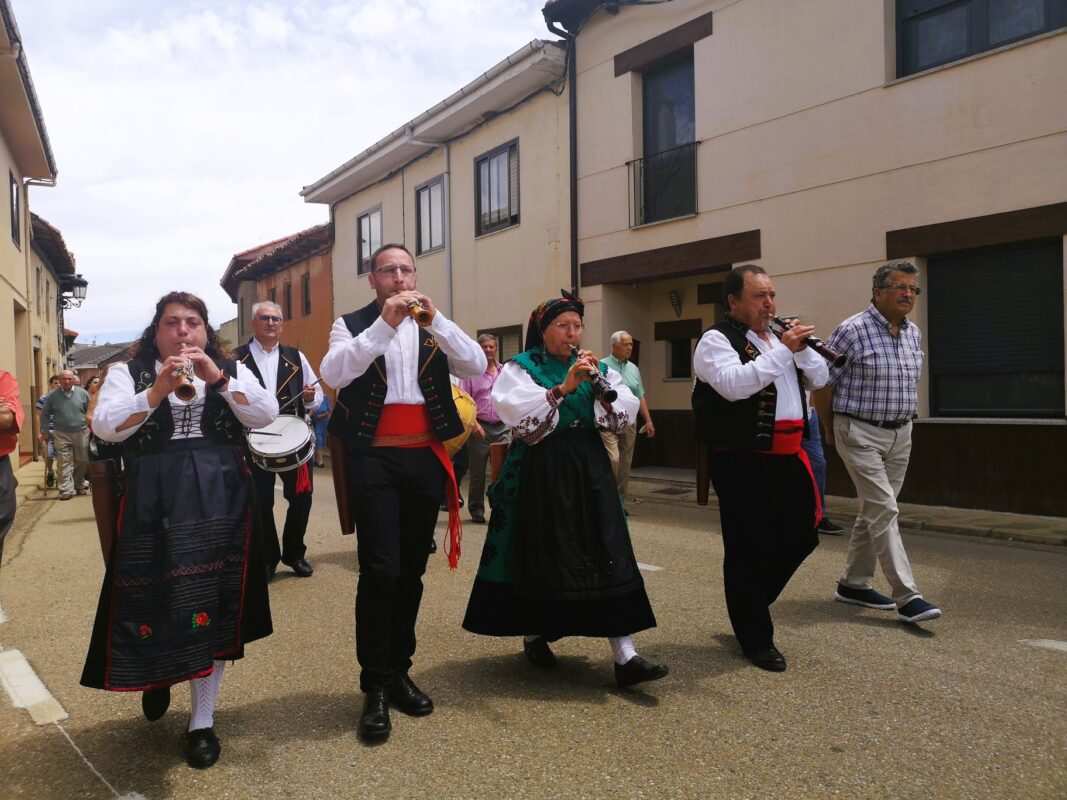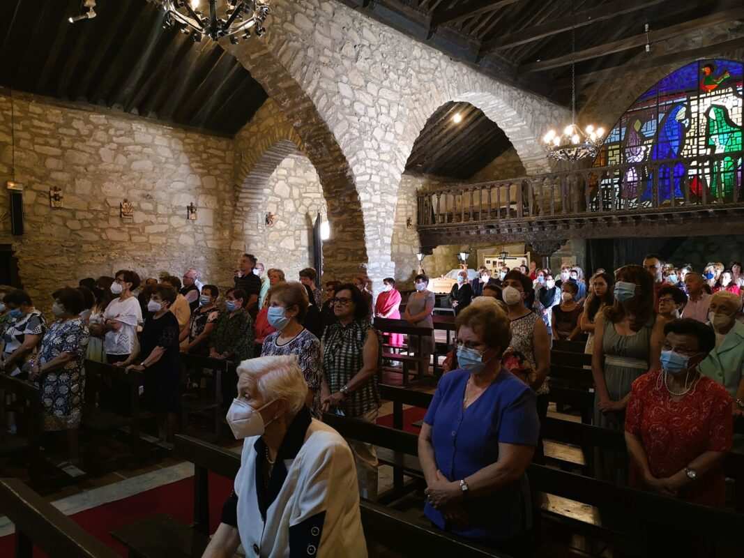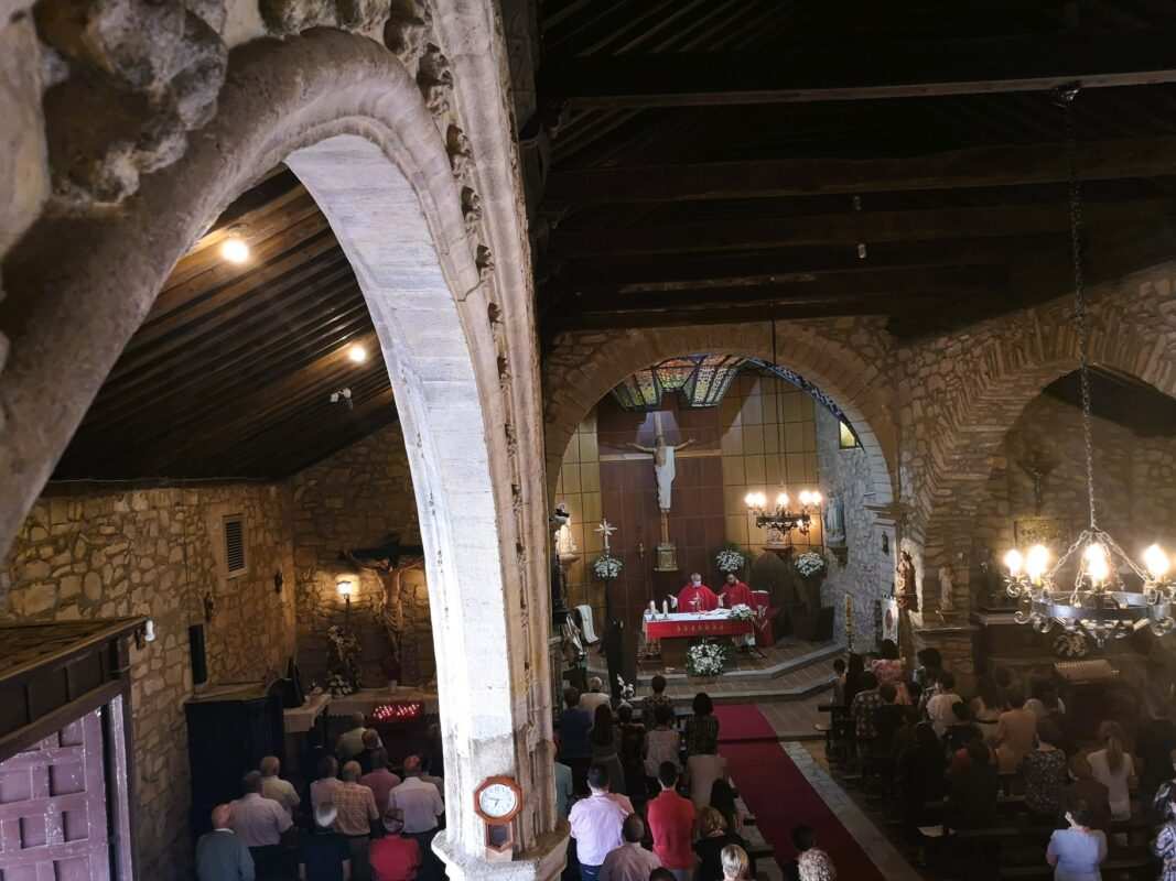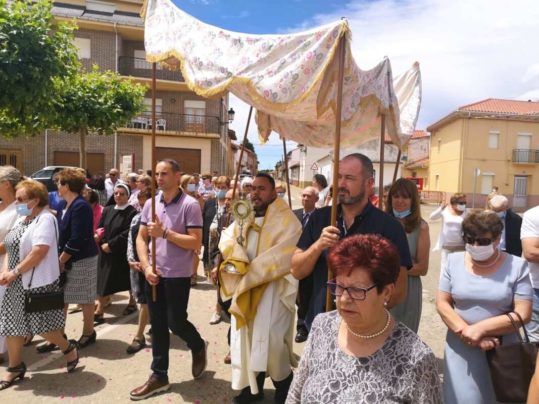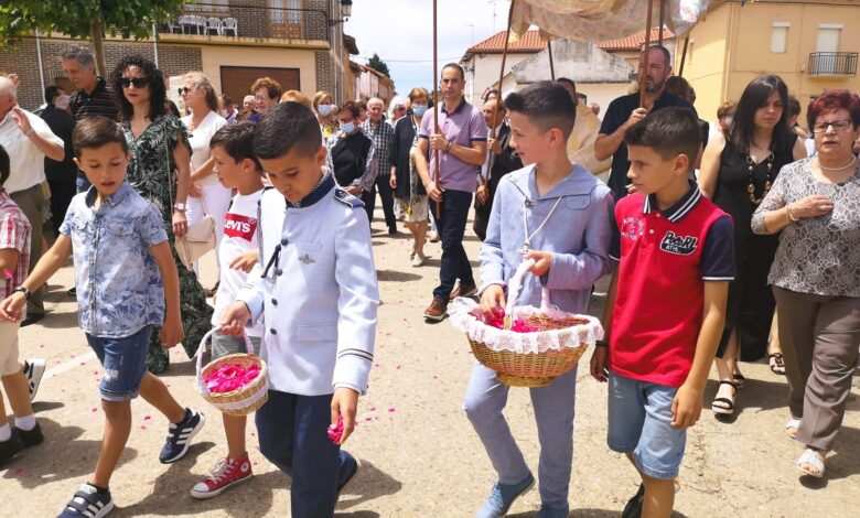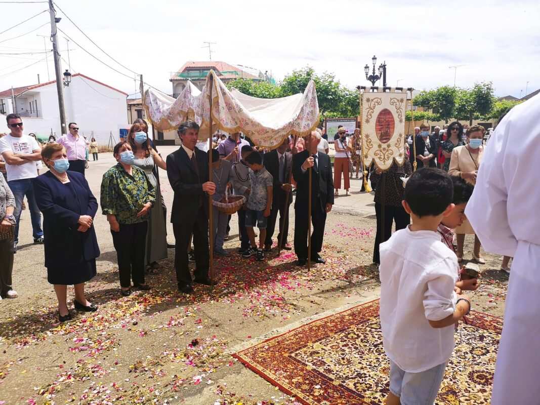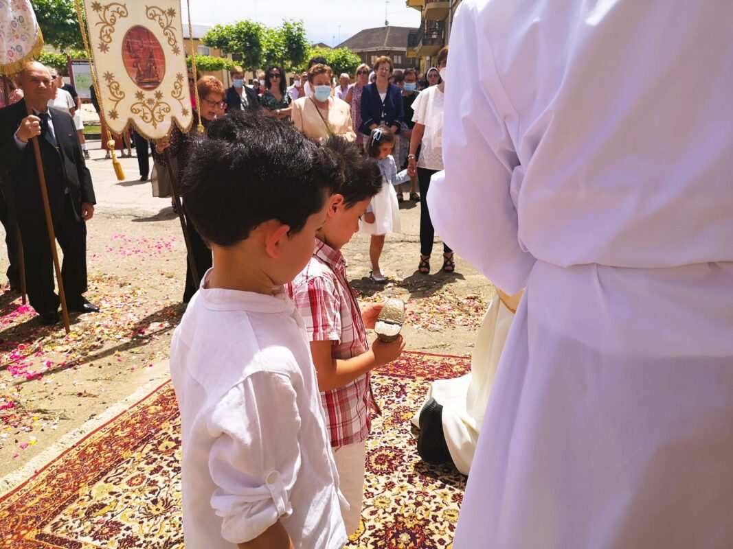 La comitiva salía del templo parroquial, bajo un incesante repique de campanas, enfilando el camino hasta la plaza Mayor, hasta el altar instalado a las puertas de la ermita para realizar el regreso a la iglesia. Durante el recorrido, los niños que este año han hecho la Primera Comunión, Adrián y Pablo, se encargaban de arrojar pétalos de rosas al paso de la Custodia mientras otros dos niños portaban el incensario y la naveta llenando de fragancias el desfile.