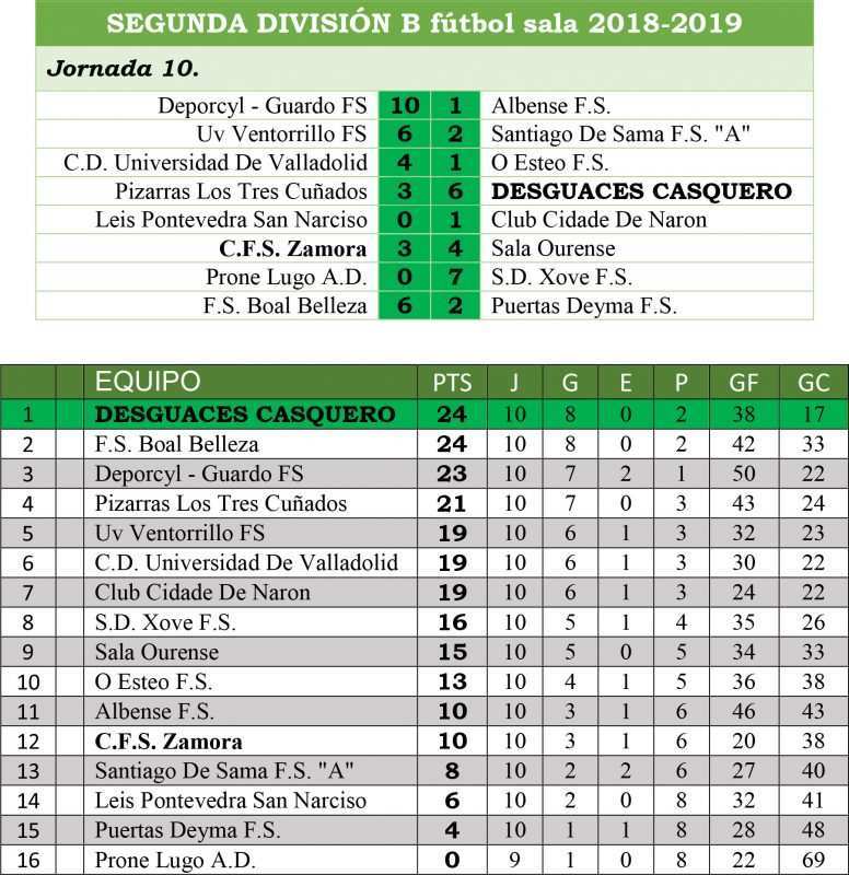 La segunda división b del fútbol sala tiene nuevo líder y no es otro que el Desguaces Casquero tras vencer en la cancha del que hasta este sábado comandaba la tabla de esta categoría. Los de Chema Sánchez hicieron la proeza de vencer en la cancha gallega a un gran equipo que, sin embargo, no pudo con el ritmo, el juego y el trabajo de un Desguaces Casquero que vuelve a colocar a Benavente en lo más alto de la tabla. Los benaventanos retornan al liderato más de un año después cuando el 30 de septiembre del año pasado compartía liderato con Guardo y con Albense y que perdía en la semana siguiente precisamente ante el cuadro de Alba de Tormes.
