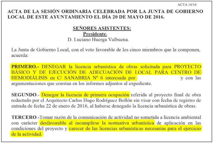 El propio exalcalde, decretó en noviembre del 2022, la caducidad del expediente Proyecto Básico de Ejecución de local para Centro de Hemodiálisis ubicado en la Calle Sanabria. Como consecuencia de esta actividad, el propio Ayuntamiento sancionó en reiteradas ocasiones a la empresa por molestias a los vecinos, sanciones que en algún caso superaron los 12.000 €.
