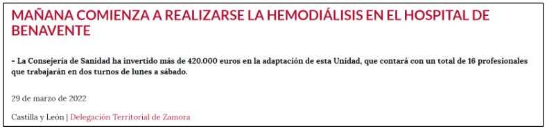 Se cerró el servicio de diálisis que venía ofreciéndose en la Calle Sanabria, trasladándose el mismo al Hospital del Benavente, donde se atiende a los pacientes con todas las garantías desde marzo del 2022.