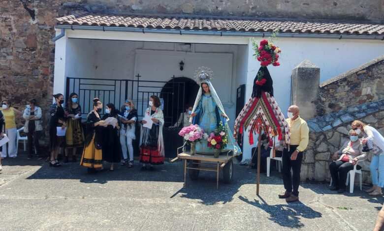 Los devotos de la Señora del Amor Hermoso entonaron un canto marcado por versos en los que se pide a la Virgen que ponga fin a la pandemia. No se han olvidado de los agradecimientos a sanitarios y versos dedicados a la despoblación que sufren los pueblos.»