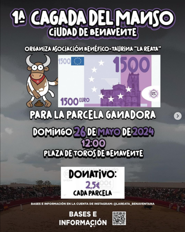 La Asociación Benéfico-Taurina ‘La Reata’ ha presentado un peculiar sorteo que se celebrará el día 26 de mayo a las doce de la mañana. Bajo el nombre la 1ª Cagada del Manso, los participantes tendrán que acertar el lugar exacto donde defecará por primera vez el manso que saltará a la plaza durante un tiempo limitado.