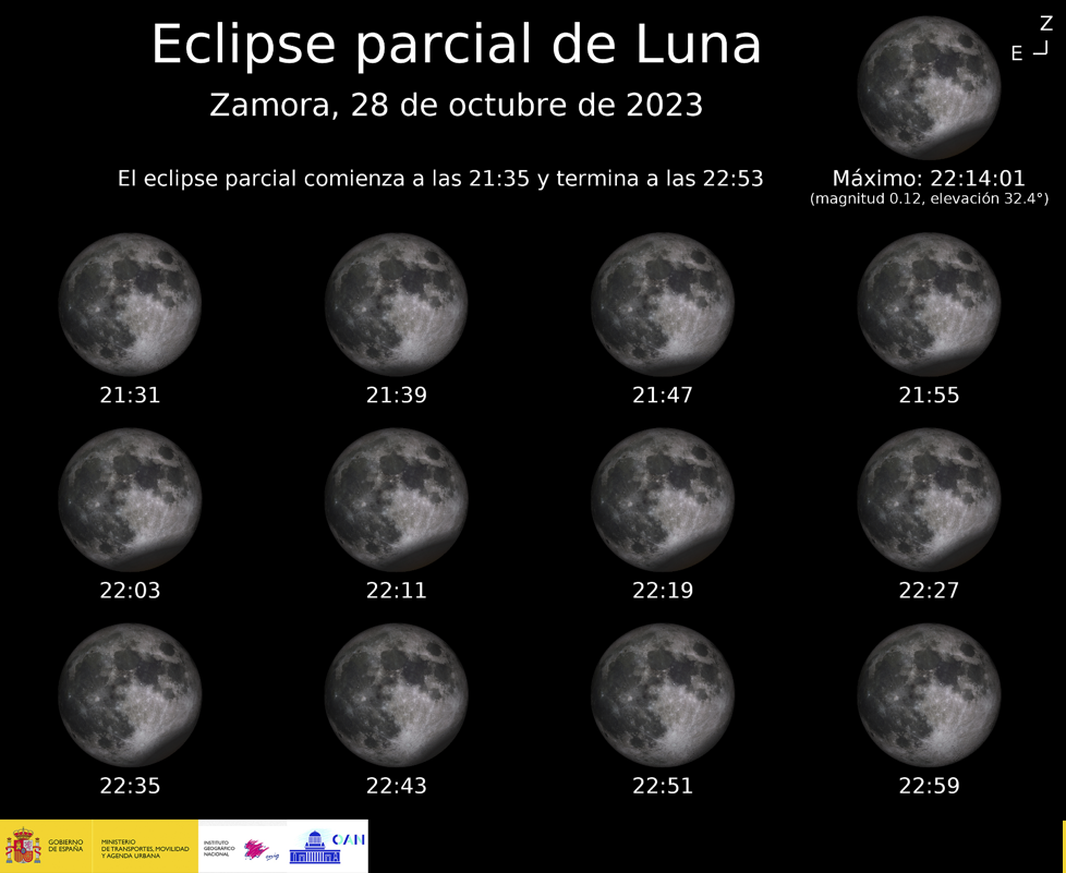 Según los datos del Instituto Geográfico Nacional para toda España y, en concreto, para la provincia de Zamora, la Luna comenzará a entrar en la umbra de la Tierra (la parte más profunda y oscura de la sombra) a las 21.31 horas, y alcanzará su máximo a las 22.14, en que el eclipse alcanzará su máxima magnitud (0.12).