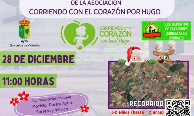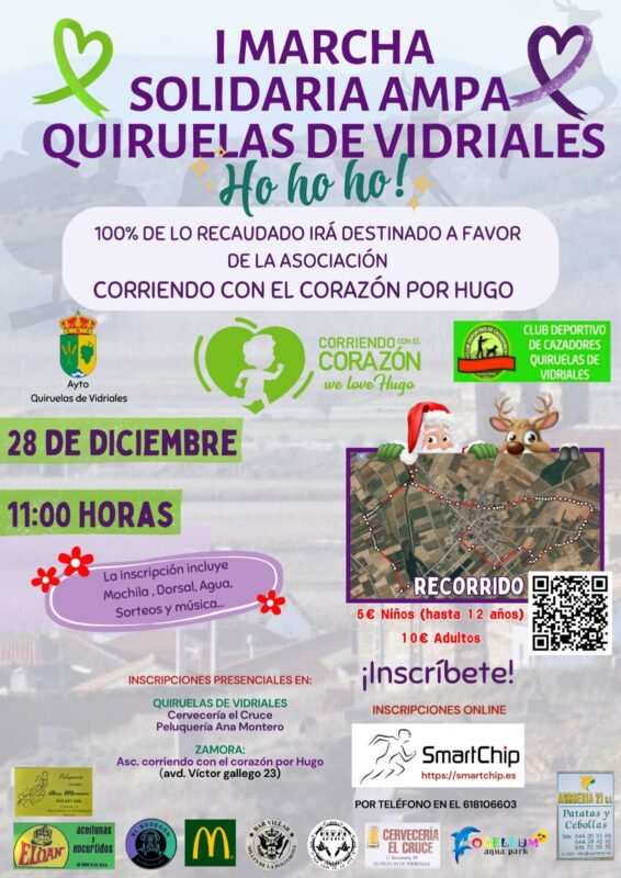 El próximo 28 de diciembre, a las 11:00 horas, Quiruelas de Vidriales acoge la I Marcha Solidaria organizada por la asociación de madres y padres de alumnos (AMPA), en colaboración con la asociación Corriendo con el Corazón por Hugo, así como el Ayuntamiento, el club deportivo de cazadores de Quiruelas y varias firmas comerciales.