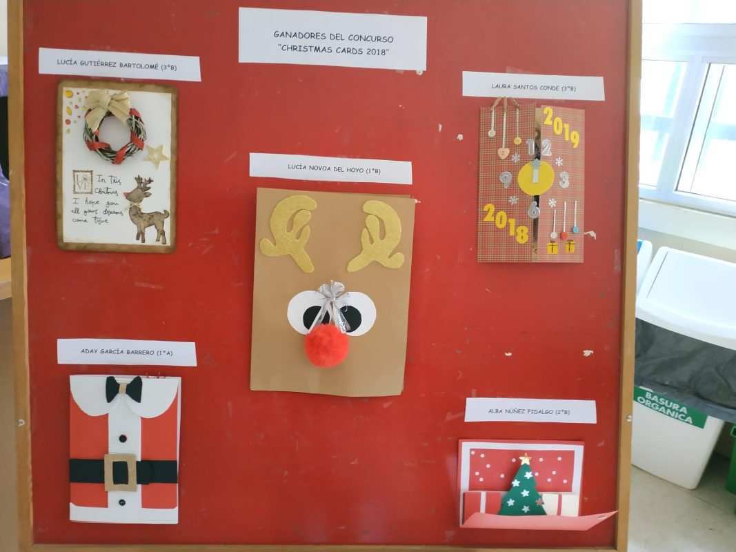 Por otro lado y como viene siendo habitual en estas fechas, el departamento de inglés ha organizado un concurso de postales de Navidad (Christmas cards). El martes 18 de diciembre se celebró la entrega de los premios a los cinco ganadores. Las postales se encuentran expuestas en el hall del centro para que todos los profesores, alumnos y personal del centro puedan disfrutar de ellas, siendo los ganadores los siguientes: