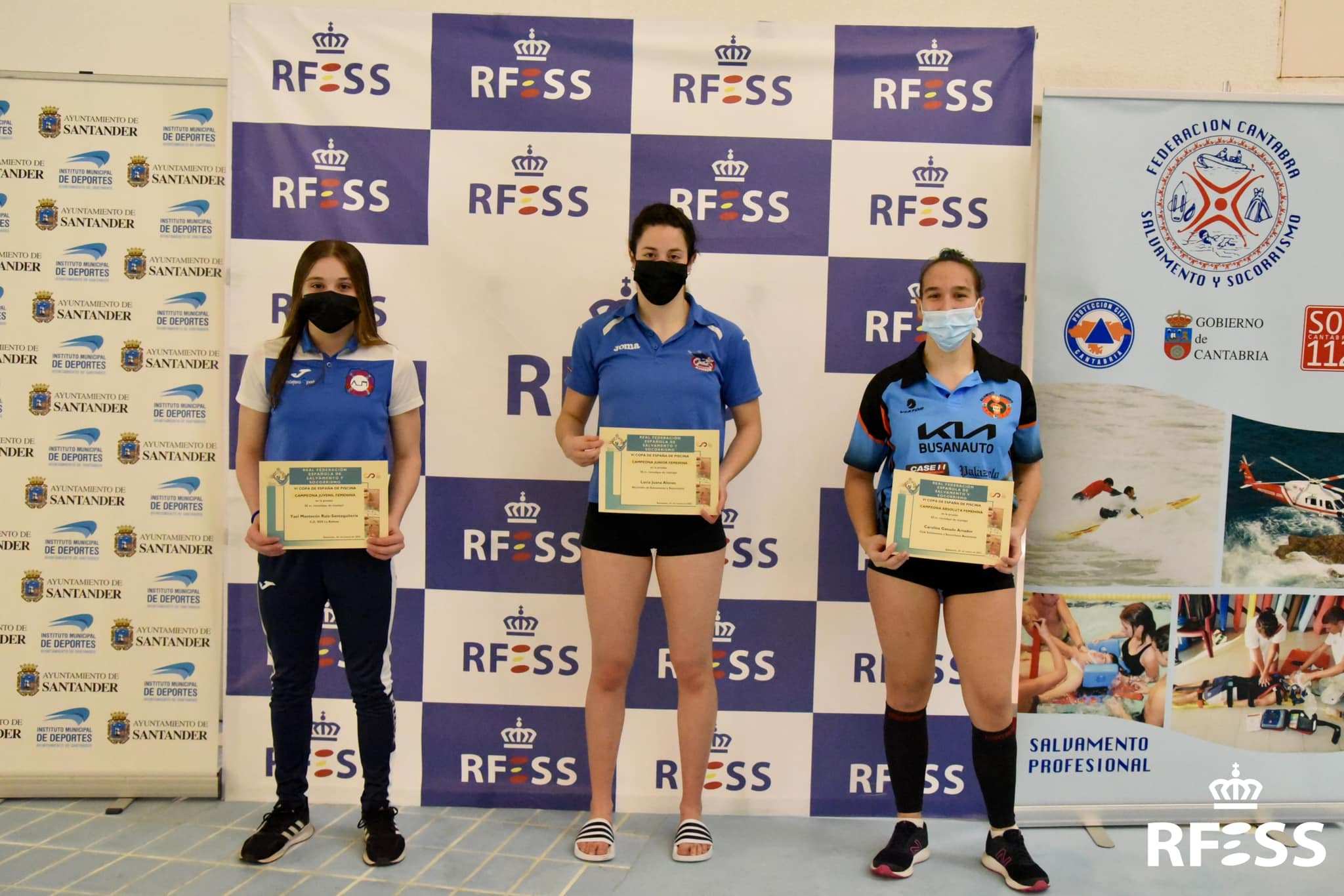 El resto de medallero de la categoría femenina fue de la mano de Carolina Ganado Amador (C.S.S. Benavente) con dos oros en 200 metros supersocorrista y 200 metros natación con obstáculos, una plata en 50 metros remolque de maniquí y un bronce 100 metros combinada de salvamento; Diana Turrado Álvarez (C.D. SOS La Bañeza) con un bronce en 100 metros remolque de maniquí con aletas; y Sara Peña Merino (C.D. Unión Esgueva SOSVA) con un tercer puesto en 200 metros supersocorrista.