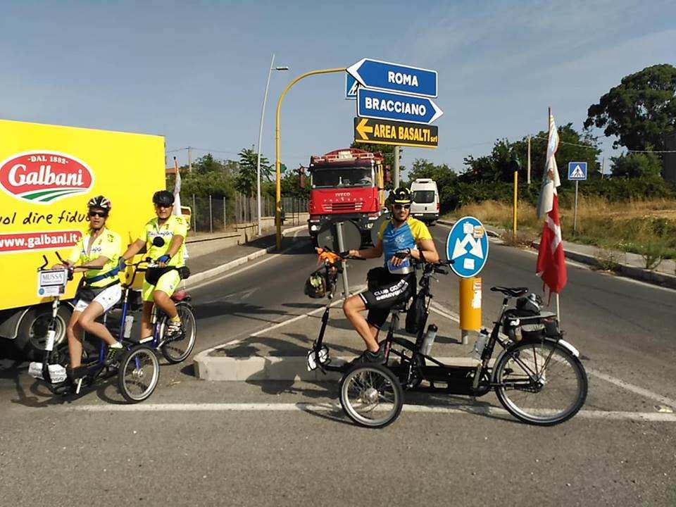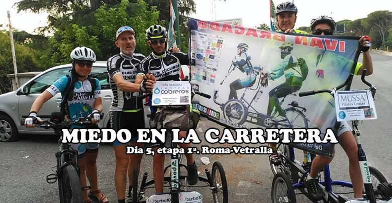 Despertador a las 5 de la mañana porque es una locura el calor que hace por estos lares después de las 12 y para evitarlo hemos de estar pedaleando a las 06:30 de la mañana. Hoy no ha podido ser posible porque teníamos un montón de cosas en contra ya que había que levantarse, vestirse, desayunar, recoger, cargar, salir del centro de Roma, aparcar, descargar toda la furgoneta, bajar los Triciclos, montarlos, colocar los carteles de los patrocinadores, volver a cargar la furgoneta, revisar la dirección de los triciclos que siempre en los viajes sufre (uno de ellos de hecho tenía una desviación de 2 CMS). En fin, que con todo eso hemos empezado a pedalear a las 08:30 y eso, y los 10 kms de más de que nos hemos chupado por seguir al pie de la letra las indicaciones de un paisano, ha hecho que la etapa terminará a las 14:30, cuando el asfalto ya no es compacto, sino pura papilla.