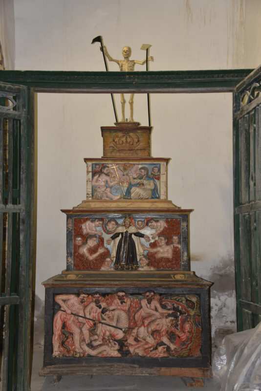 Encargado por la cofradía de los Falifos en 1722, el túmulo funerario, conocido popularmente como «tumbo», es una estructura impresionante que se utiliza durante la misa del «Lunes de Carballeda». Con una altura de 4 metros y una base de 1.85 metros de ancho, está compuesto por cuatro cuerpos cuadrangulares decrecientes, conocidos como «mesas del túmulo». Cada nivel está adornado con imágenes aterradoras del purgatorio y el infierno, culminando en un espectral esqueleto conocido como «la muerte de Carballeda».