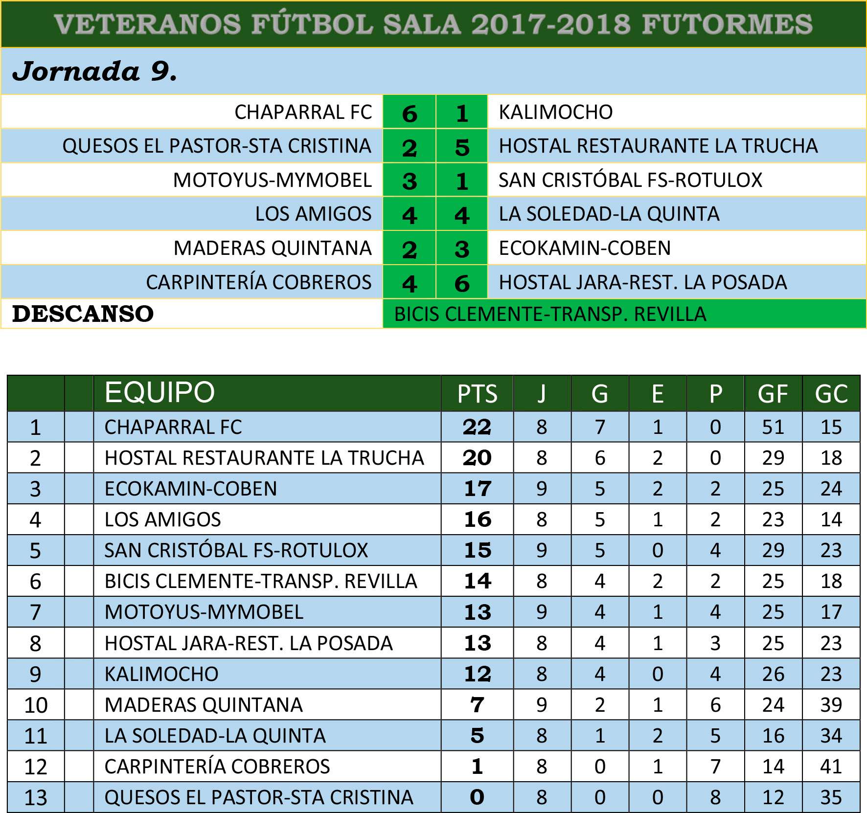 Jornada de descanso para la Liga Futormes Caja Rural y nueva jornadas para la de Fútbol 7 y Liga de Veteranos de Fútbol Sala, en las que sin embargo no hay cambios de líderes. Santa Cristina, Bicis Clemente-Transportes Revilla y Chaparral siguen con paso firme en las cabezas de las respectivas clasificaciones. Llama la atención la última jornada disputada en Fútbol 7 donde los tres encuentros finalizaban en empate desperdiciando una ocasión de oro Ilbesa-Tecnicomputer para auparse al primer puesto de la tabla.