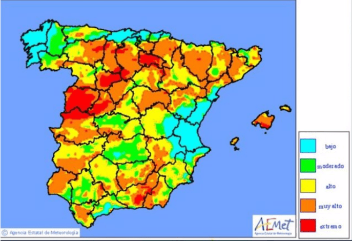 Las zonas donde el riesto es «extremo» es en la práctica totalidad de la provincia de Salamanca, y en el suroeste de Ávila, así como en el este de la provincia de Valladolid, y en diversas zonas del norte de León, y de la parte norte y sur de Palencia y Burgos.