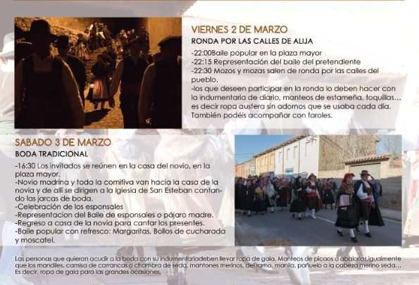 El primer fin de semana de marzo, Alija del Infantado celebrará la representación de ronda y boda. El viernes por la noche comenzarán con un baile popular en la Plaza Mayor y acabarán los mozos y mozas de ronda por las calles del pueblo. El sábado será el gran día de la boda tradicional.