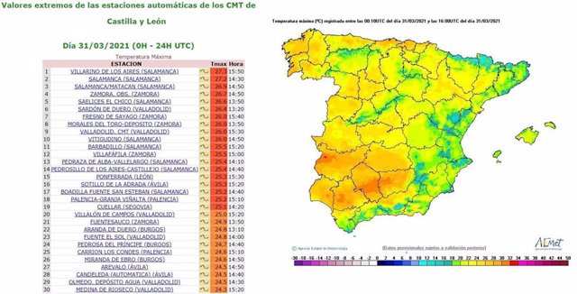 La máxima temperatura en el histórico de la Aemet la tiene, a día de hoy, Ponferrada con 27,2 alcanzados también ese 10 de marzo del 2017, por lo que Salamanca iguala este registro. Sin embargo hoy, la estación de Villarino (Salamanca) ha superado esa temperatura al marcar 27,3, si bien de este punto no hay serie histórica.