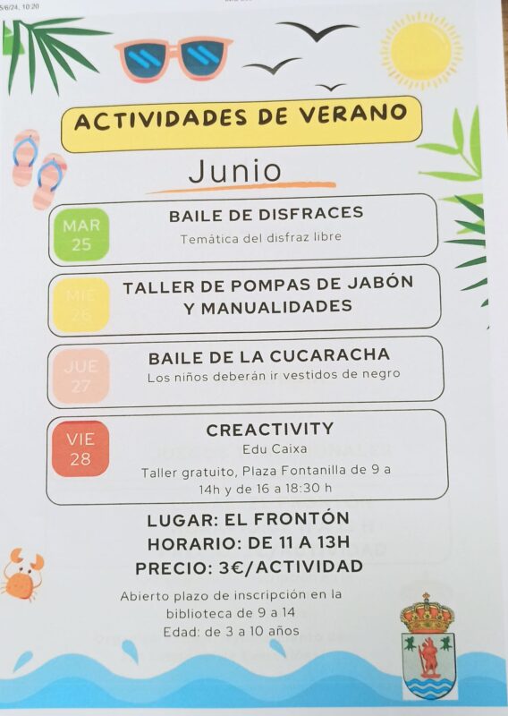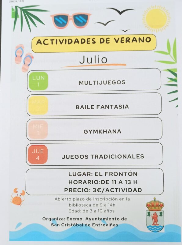 El Ayuntamiento organiza, además, durante las mañanas del mes de junio y del mes de julio varias actividades de ocio, en el frontón municipal.