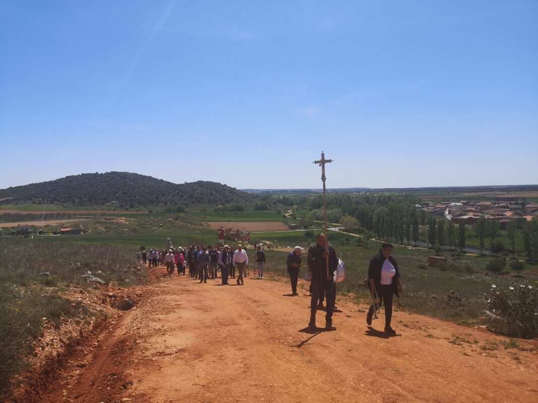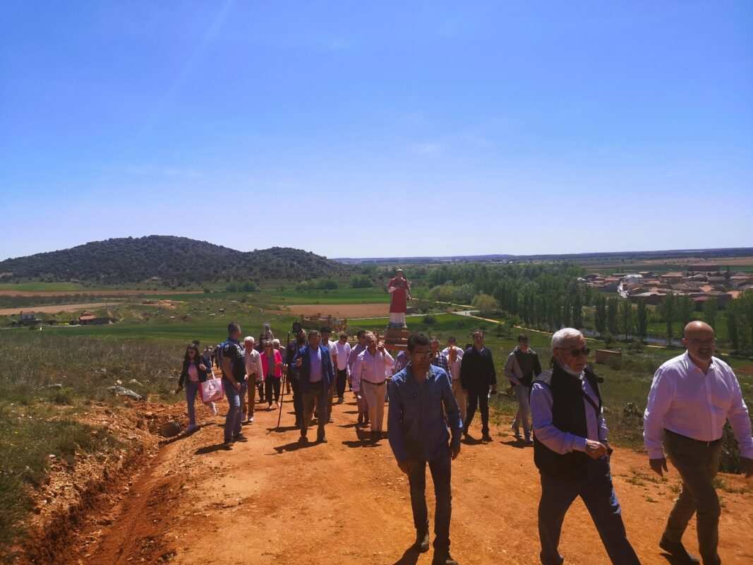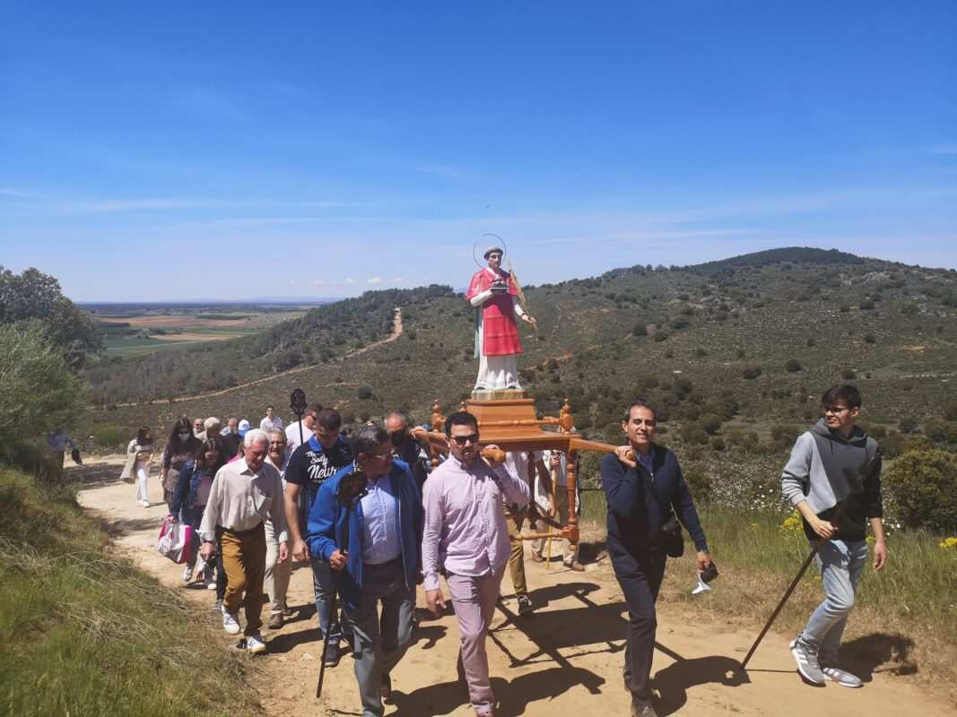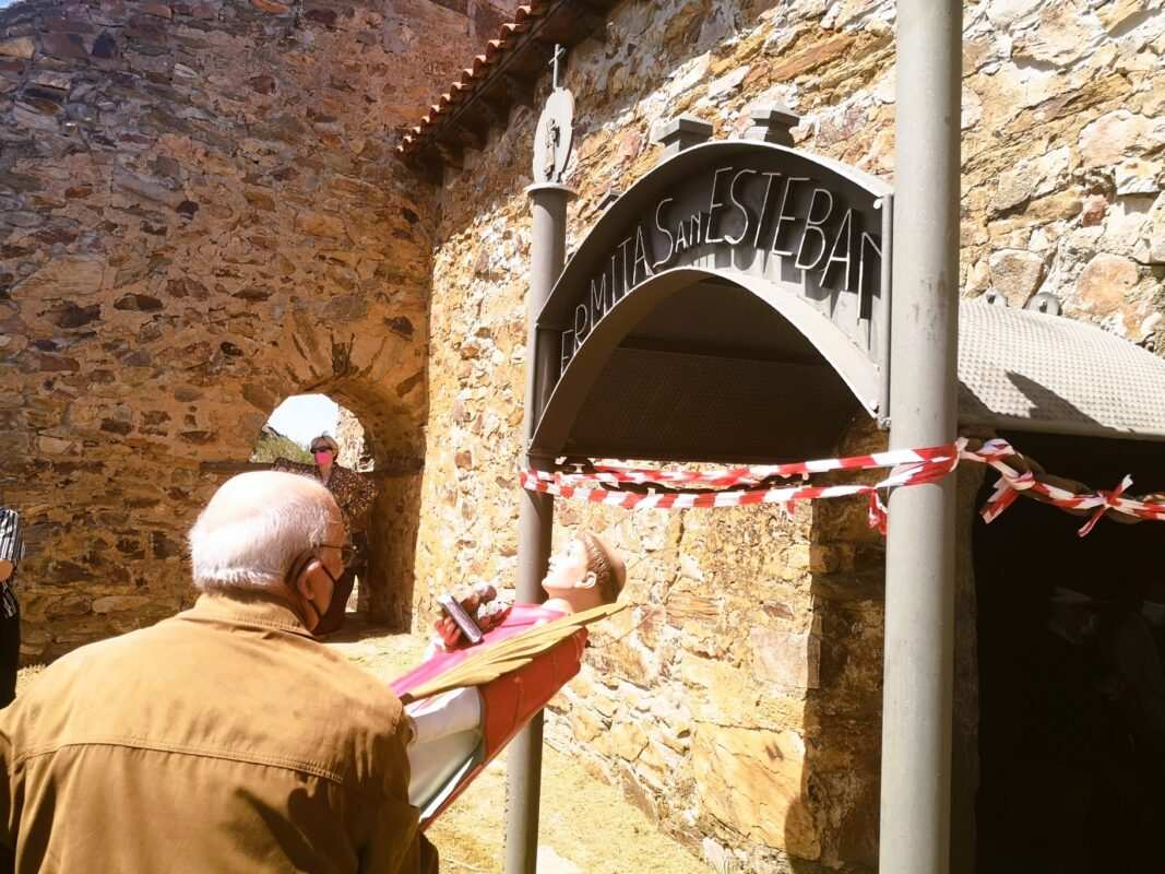 Y cuando el sol manifestaba todo su vigor, al marcar el reloj las 13:00 horas, la imagen del patrón cruzaba el pórtico del templo para enfilar una comitiva en dirección al cerro que lleva su nombre, a donde se alza su ermita. La procesión abierta con la cruz guía, señalaba el camino romero tras atravesar el arroyo Almucera para ascender hasta la platea de San Esteban mientras los sonidos de la agrupación musical «los Jatas», de Arrabalde, apaciguaban el incesante disparo de cohetes dejando una estela en el limpio cielo. Ya en la cumbre rocosa, donde se asentó un antiguo poblado, el párroco Miguel Hernández bendijo la campiña en nombre del patrón.