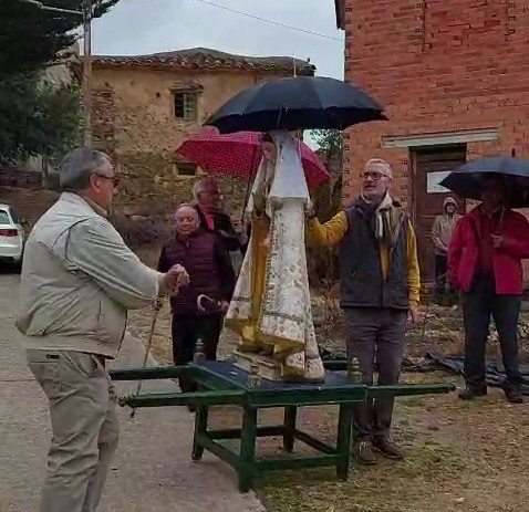 Durante el desfile procesional aparecía tímidamente la lluvia, teniendo algunos devotos que cubrir la imagen de la Virgen con un paraguas para preservar su blanca túnica y capa pluvial bordada con delicados hilos de oro.