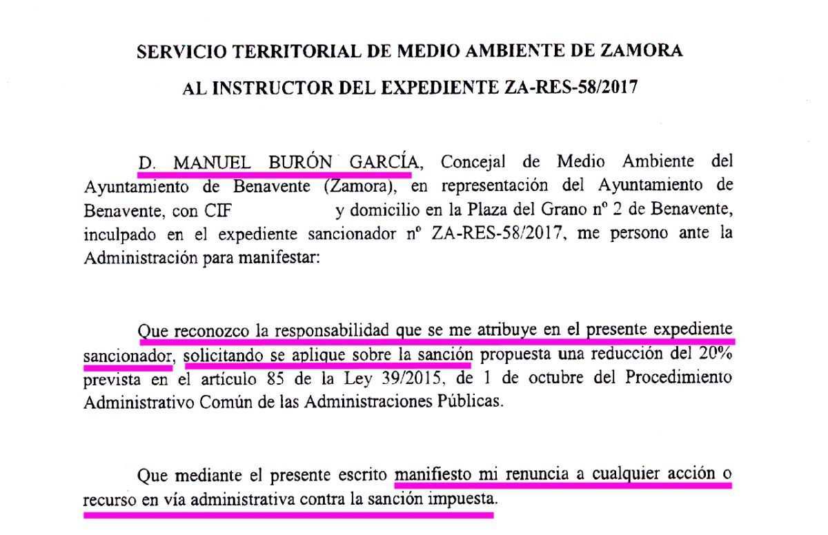 El Teniente Alcalde del Ayuntamiento de Benavente comunicó por escrito el reconocimiento de los hechos por parte del Ayuntamiento y su responsabilidad, efectuando el pago voluntario de la sanción impuesta, 1.200 €. Tras el reconocimiento de los hechos, el PP pidió la dimisión del Teniente Alcalde de Benavente, ya que como responsable de la Concejalía de Medio Ambiente en el Ayuntamiento de Benavente, debería de haber velado por proteger el mismo en lugar de infringir la normativa. Y al mismo tiempo, porque ha vulnerado el juramento realizado el día que juró el cargo, de cumplir la Ley, algo que es evidente que no lo hizo y, además, lo ha reconocido por escrito.