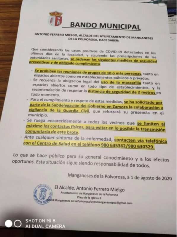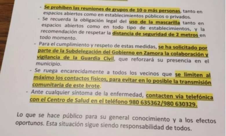 La situación ya ha llevado al alcalde de Manganeses de Polvorosa, Antonio Ferrero Mielgo, a tomar las primeras medidas desde el propio Ayuntamiento, para preservar la seguridad de los vecinos. Por ello, a través de un bando municipal, el Consistorio prohíbe las reuniones de diez o más personas y recuerda el uso obligatorio de mascarilla y de mantener la distancia de seguridad.