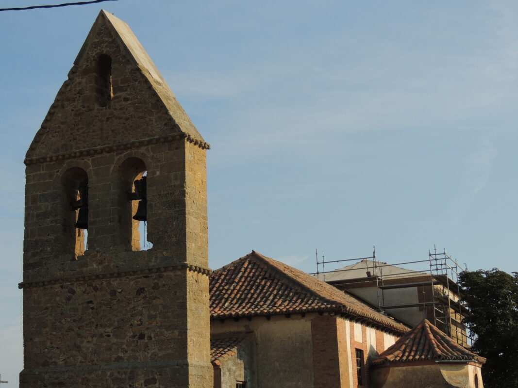 La iglesia dedicada a la Virgen de la Asunción en Villanueva de Azoague, durante los trabajos de renovación de la cubierta