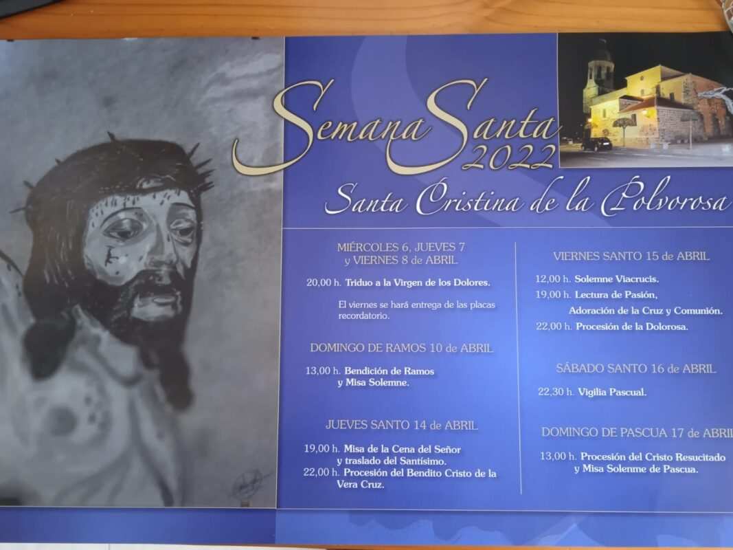 Santa Cristina de la Polvorosa abre este miércoles 6 de abril los actos de la Semana Santa con el Tríduo a la Virgen de los Dolores. El viernes está dedicado a la titular de la cofradía, la Virgen de los Dolores, con una celebración prevista a las 20:00 horas donde se hace entrega de las placas recordatorio a los hermanos cofrades, tanto a la que ha sido la mayordoma durante dos años seguidos debido a la pandemia, como en homenaje póstumo al que ha sido vicepresidente Miguel Pernía en reconocimiento a su labor en el órgano cofrade.