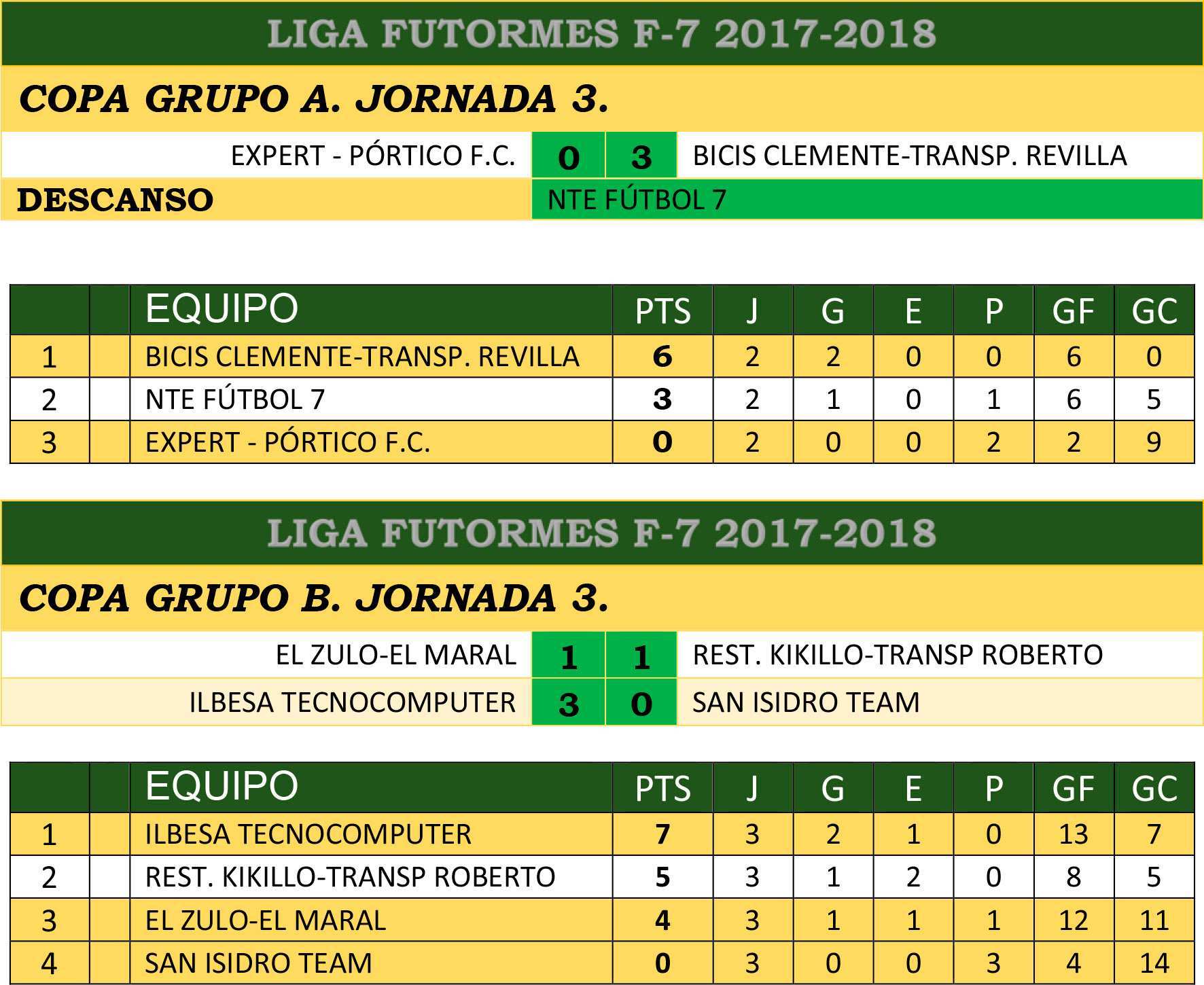 La liga de Fútbol 7 también jugaba el pasado lunes la tercera jornada de la Copa en la hay que destacar el empate del que fuera Campeón de Liga, Restaurante Kikillo-Transportes Roberto con el Zulo-el Maral lo que deja despejado el camino al Ilbesa-Tecnocomputer dentro del grupo B. En el grupo A Bicis Clemente-Transportes Revilla no se dejaba sorprender y ganaba en el único partido de este grupo por 0-3. Hoy se disputará la cuarta jornada, primera de la segunda vuelta, en la que se conocerán los dos clasificados de cada uno de los dos grupos que pasen a las semifinales de esta Copa.