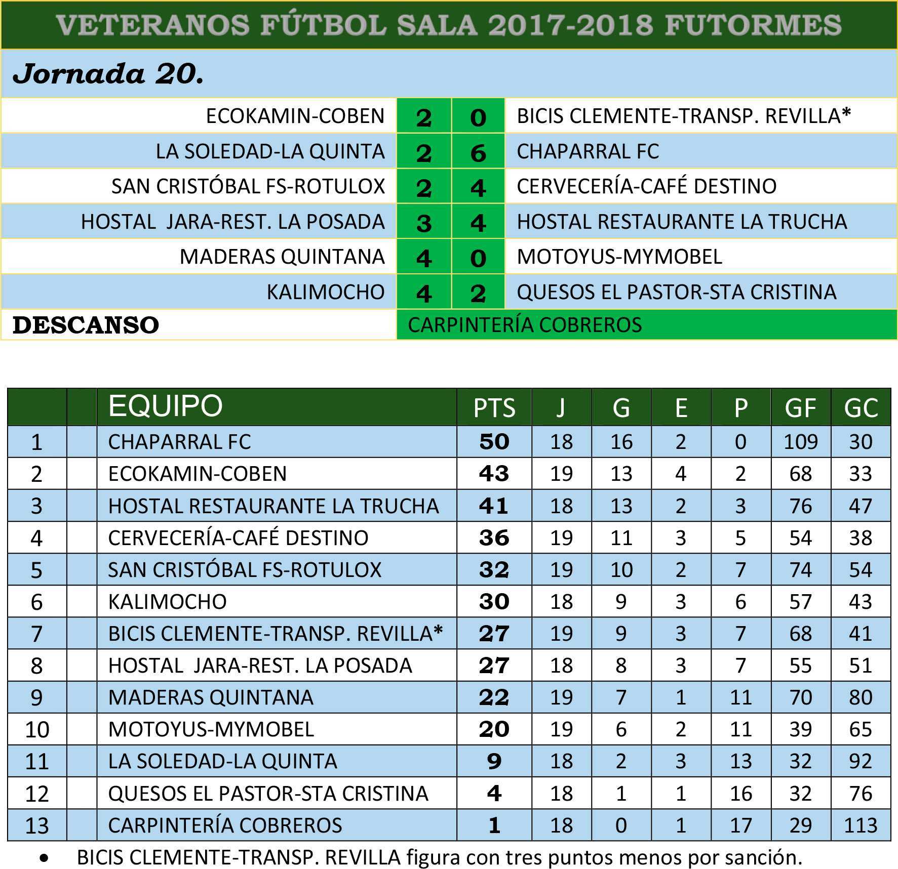 En la liga de Veteranos de Fútbol Sala todo todo se mantiene sin cambios, tanto por arriba como por abajo. Chaparral sigue cada vez más cerca de alzarse con el título de liga sin que Chimeneas Ecokamín-Coben Cerámicas ni Restaurante La Trucha puedan darle caza. Por debajo Carpintería Cobreros, que descansaba, no abandona el puesto de colista con tan sólo un punto sumado.