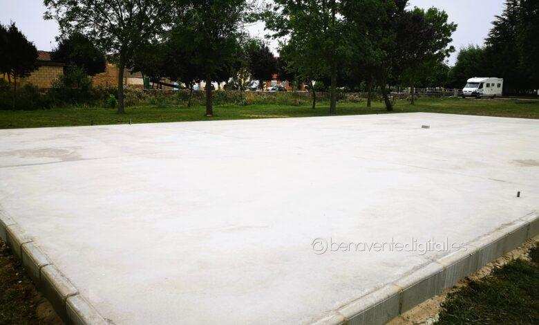 Esta ejecución dispone ya del solado de hormigón enfilado de bordillos en la amplia zona verde de acceso a las instalaciones deportivas y zona ribereña, junto a la provisión de agua para las autocaravanas, con una superficie de 11 metros x 21 metros para que quede una pista de 10 metros x 20 metros. Se tratará ahora de acometer la instalación de la estructura en sintonía a las ejecutadas hasta ahora en la comarca.