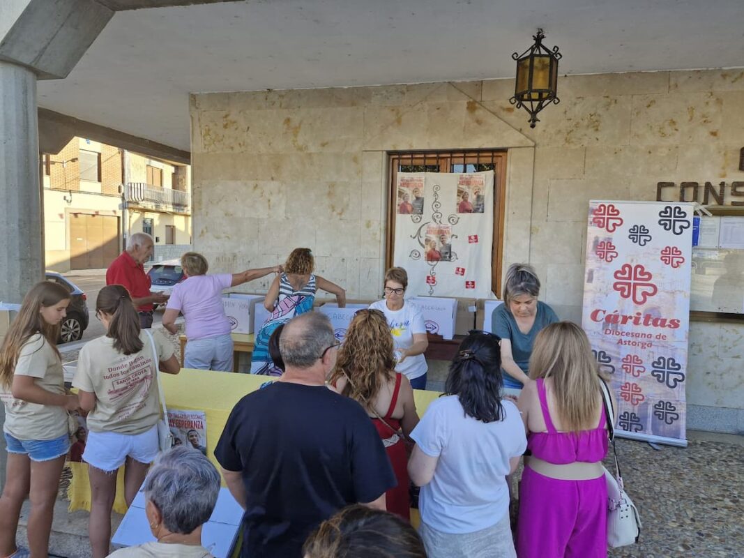 Bajo los soportales de la Casa Consistorial se instalaron las mesas para distribución de los bocadillos con cartelería alusiva a Cáritas de la UPA Los Valles-Tábara, con el lema: “Mientras haya personas, hay esperanza”. Podemos llamarlo caridad, generosidad o simplemente humanidad. Porque ayudar lo llevamos dentro.