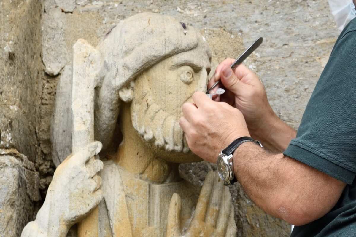 La escultura pétrea del Santiago Peregrino más antigua que se conoce se encuentra en fase de análisis y estudio de la piedra a través del propio organoléptico de la imagen y los análisis químicos de la arenisca que conformarán el estudio petrológico de esta escultura, así como de las que representan a las figuras de San Juan y San Judas.