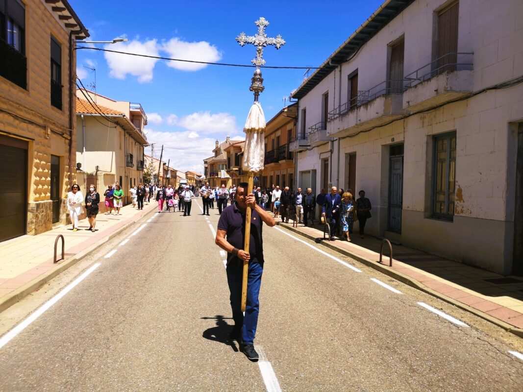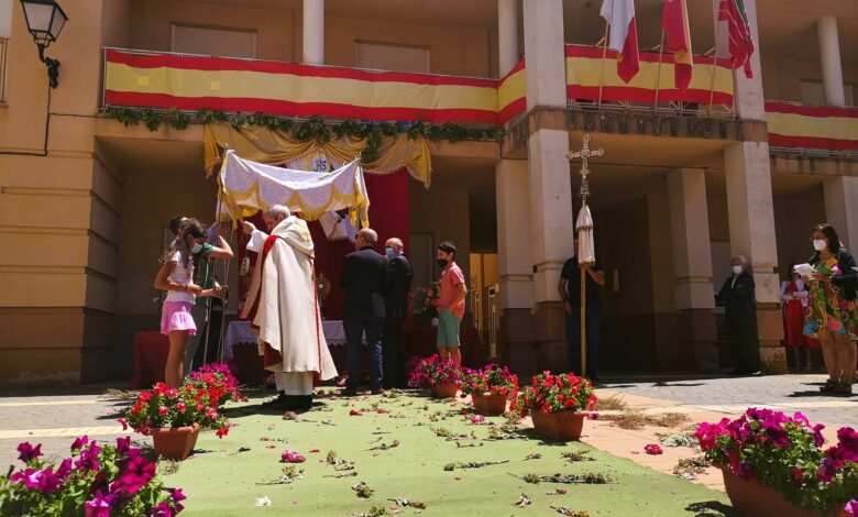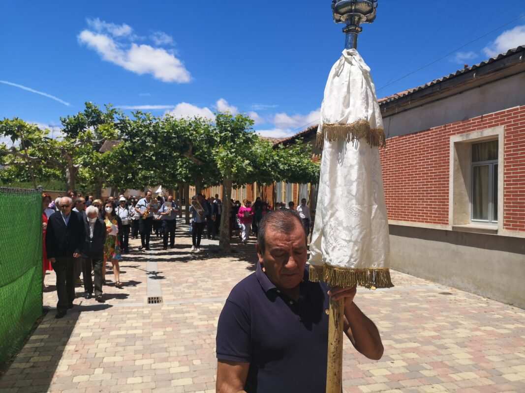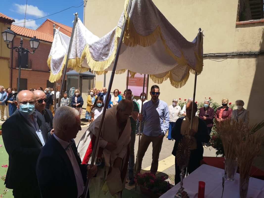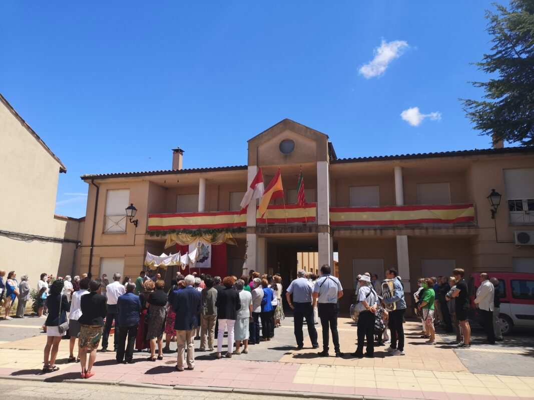 Las fragancias de las flores del campo, la urz y el romero, llenaban de sensaciones a los vecinos, a las puertas de la iglesia y en la plaza del Ayuntamiento donde se instaló un altar profusamente decorado. La comitiva enfiló el patio del Ayuntamiento o patio del maestro don Feliciano para su regreso al templo parroquial.
