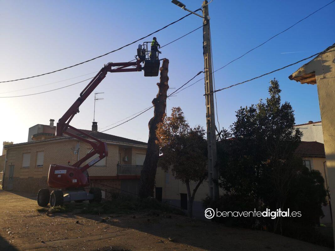 Operarios realizando trabajos de tala del pino de la plazoleta entre Mediavilla y Travesía Mediavilla en Santibáñez de Vidriales