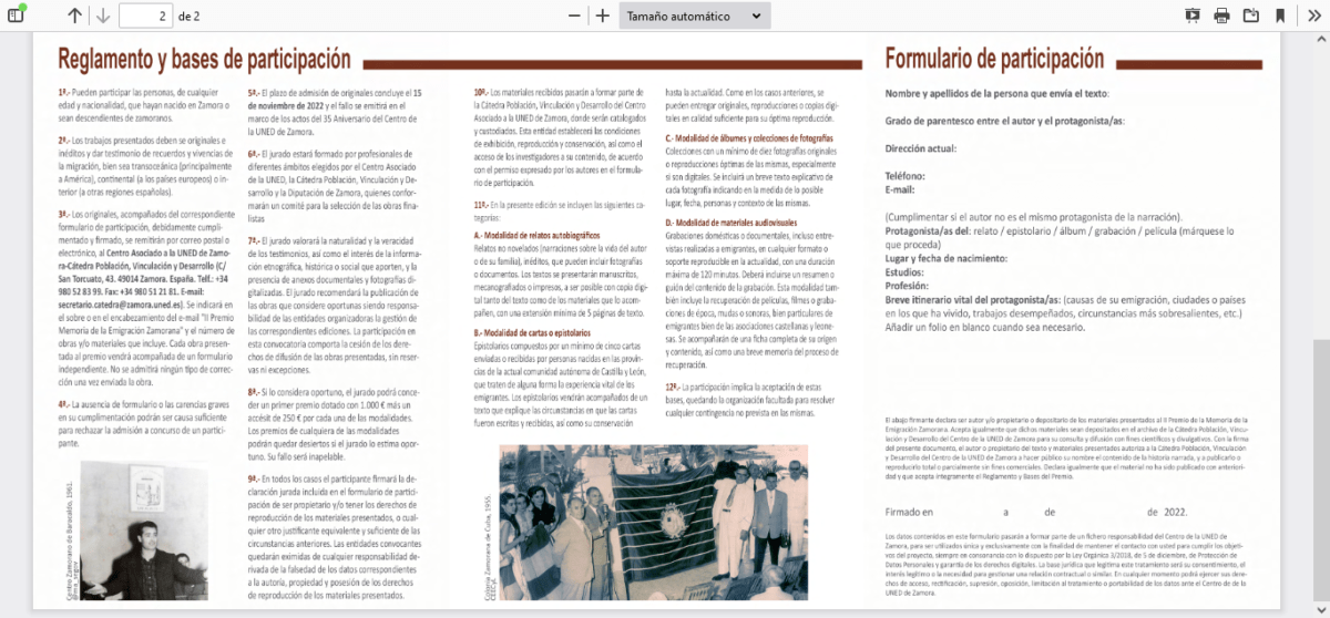 Para ello convoca estos premios en cuatro categorías o modalidades: relatos autobiográficos, cartas o epistolarios, álbumes y colecciones de fotografías y materiales audiovisuales. Estos premios estarán dotados con 1000 euros más un accésit de 250 euros por cada una de las modalidades, pero también podrán ser publicados, en los casos que se considere oportuno por parte del Jurado. Además, los materiales recibidos pasarán a formar parte de la Cátedra de Población, Vinculación y Desarrollo del Centro Asociado de la UNED de Zamora, donde serán catalogados y custodiados.