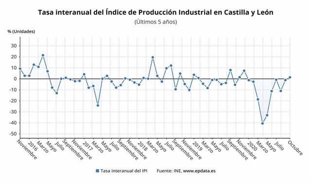 El Índice General de Producción Industrial (IPI) en Castilla y León aumentó un 1,3 por ciento en octubre en relación al mismo mes de 2019, mientras que en España se desplomó un 6,1 por ciento ampliando en más de cinco puntos el retroceso anual de septiembre (-0,6 por ciento), según ha informado este miércoles el Instituto Nacional de Estadística (INE).