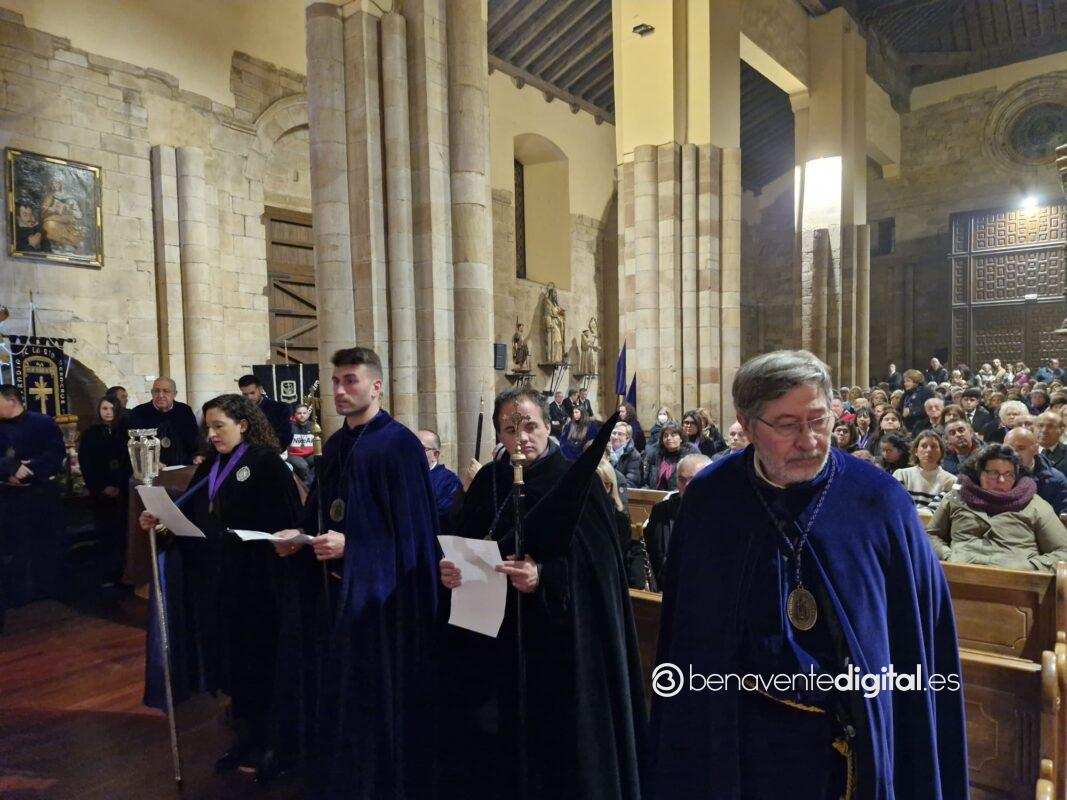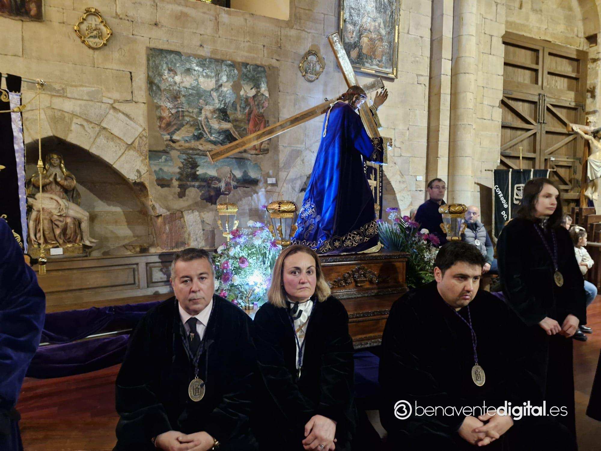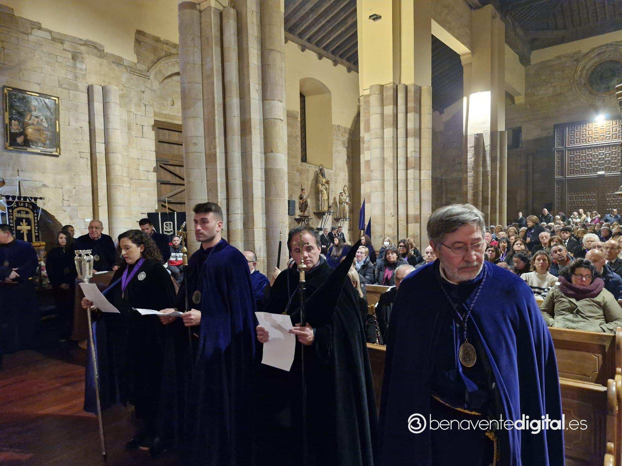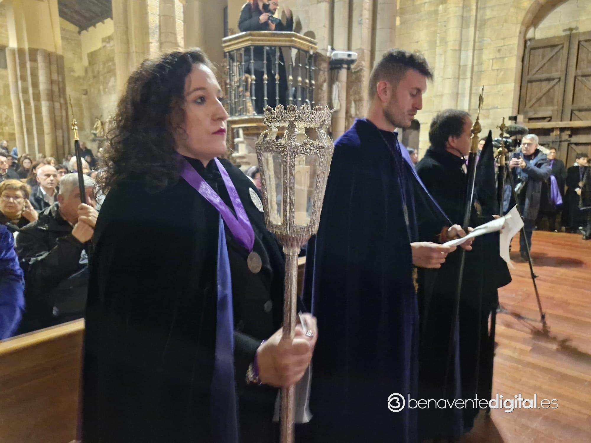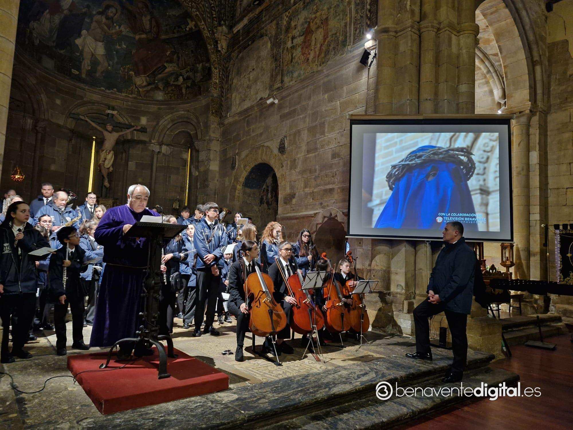 Aún así, la fe y el compromiso con la tradición persistieron, encontrando una nueva vía de expresión en el interior de la iglesia de San Juan del Mercado. El programa alternativo concebido por la cofradía se convirtió en un oasis de espiritualidad en la noche lluviosa. Se proyectaron vídeos de procesiones pasadas, producidas por Televisión Benavente, que mostraron a todos los presentes las imágenes que originalmente habrían desfilado por las calles.