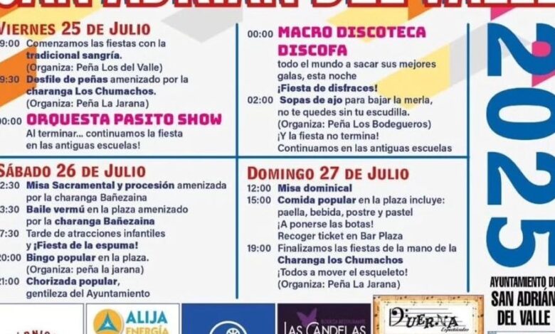 San Adrián del Valle se viste de gala este fin de semana para celebrar sus esperadas fiestas patronales 2025, que comenzarán este viernes 25 de julio y se alargarán hasta el domingo 27, con un programa cargado de actividades para todos los públicos.
