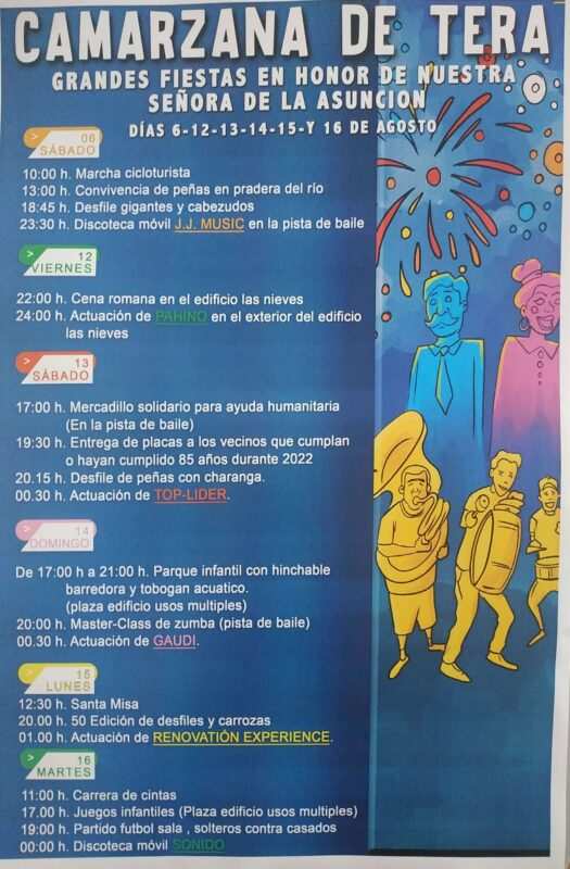 El extenso abanico de actividades que configuran el programa de las fiestas patronales en honor a Nuestra Señora la Virgen de la Asunción en Camarzana de Tera incluye los espectáculos musicales de las verbenas a cargo de Top Líder, Gaudí y Renovation Experience, además de sesiones de baile con disco móvil.