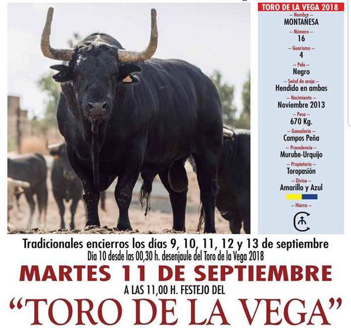 El Toro de la Vega está herrado con el número 16 y guarismo 4 (nacido en noviembre de 2013), con procedencia Murube-Urquijo y propiedad de Toropasión.