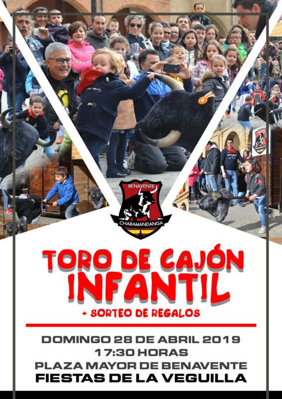 El domingo 28 de Abril, a las 17:30 horas en la Plaza Mayor de Benavente tendrá lugar el ya tradicional Toro de Cajón Infantil. Este año habrá alguna sorpresa que desde la asociación aseguran, anunciarán en breve, así como sorteo de regalos para todos los niños que se acerquen a disfrutar de la actividad.