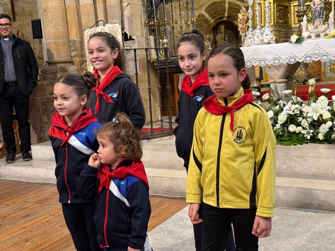Al entrar en la iglesia de Santa María del Azogue, uno de los templos más emblemáticos de Benavente con sus ábsides románicos y su rica historia, los alumnos guardan silencio respetuoso antes de comenzar la ofrenda. Los claveles y flores de temporada adornan el altar dedicado a la patrona.