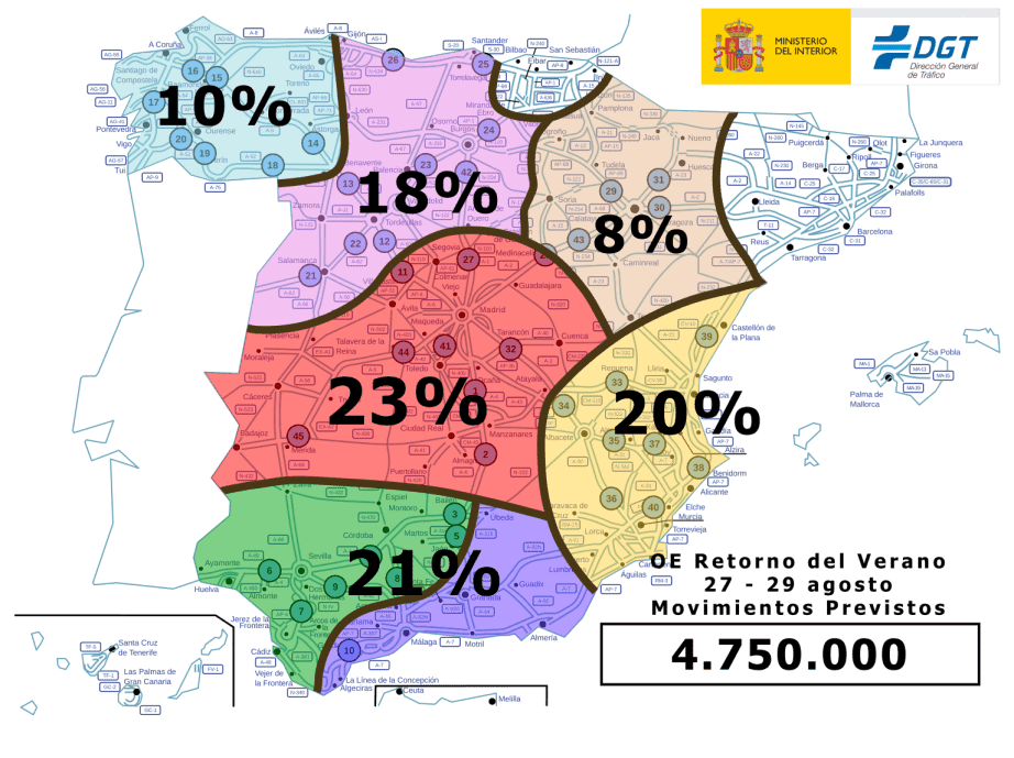 El domingo por la mañana la circulación podrá ser conflictiva en las carreteras que comunican poblaciones del litoral y accesos a zonas de playas en trayectos de corto recorrido, mientras que a partir de primeras horas de la tarde (especialmente entre las 17 y las 23 horas) comenzará el retorno, tanto de los que finalizan sus vacaciones en agosto como de los que han salido a disfrutar del fin de semana, y podrán producirse incidencias con altas intensidades de tráfico en los principales ejes viarios que comunican las zonas del litoral, montaña o segunda residencia con los accesos a las grandes ciudades.