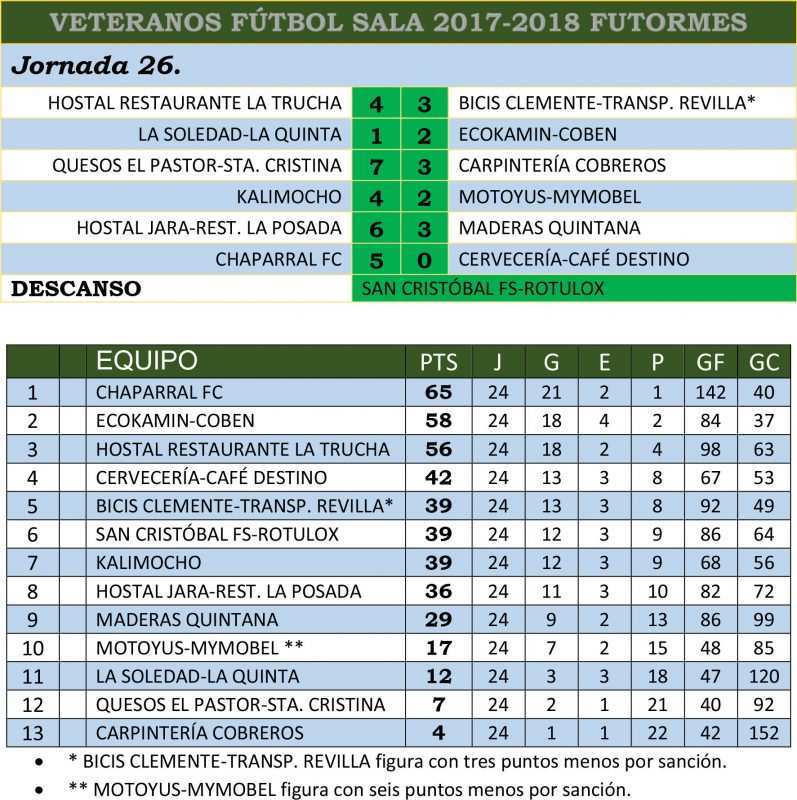 Finalizaba ayer la Liga de Veteranos de fútbol sala con todo el Chaparral como campeón desde la pasadas semana, pero sin saber quien iba a ocupar la segunda posición en la tabla. Finalmente ha sido el Chimeneas Ecokamin-Coben Cerámicas el que ha asegurado esta segunda plaza en detrimento del Restaurante La Trucha que finalmente será tercero. Amén de esto, tras el partido de ayer que cerraba la jornada y donde el Campeón de la temporada 2017-2018 era el encargado de cerrar el telón ante el Cafetería Destino, se procedió a la entrega del trofeos a todos los equipos que ha participado en esta competición y donde además el Kalimocho y el Quesos el Pastor Santa Cristina se llevaban el trofeo a la deportividad. El máximo realizador de la competición fue Daniel Lema del Chaparral con 31 goles, mientras los porteros menos batidos fueron José Merino y Juan Carlos Herrero del segundo clasificado, Chimeneas Ecokamín-Coben Cerámicas, que encajaron un total de 37 goles.