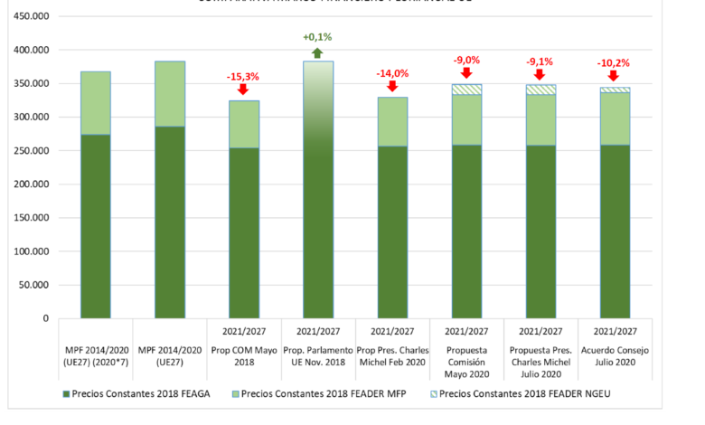 La organización destaca que la futura PAC en total sufrirá un recorte del 10,2 % respecto al periodo anterior 2014-2020, con una reducción mayor, del 11,75%, para el desarrollo rural (85.350 millones de euros, que para el capítulo de ayudas directas y mercados. que cuenta con un paquete de 258.594 millones de euros (-9,63% respecto de la partida 2014-2020).